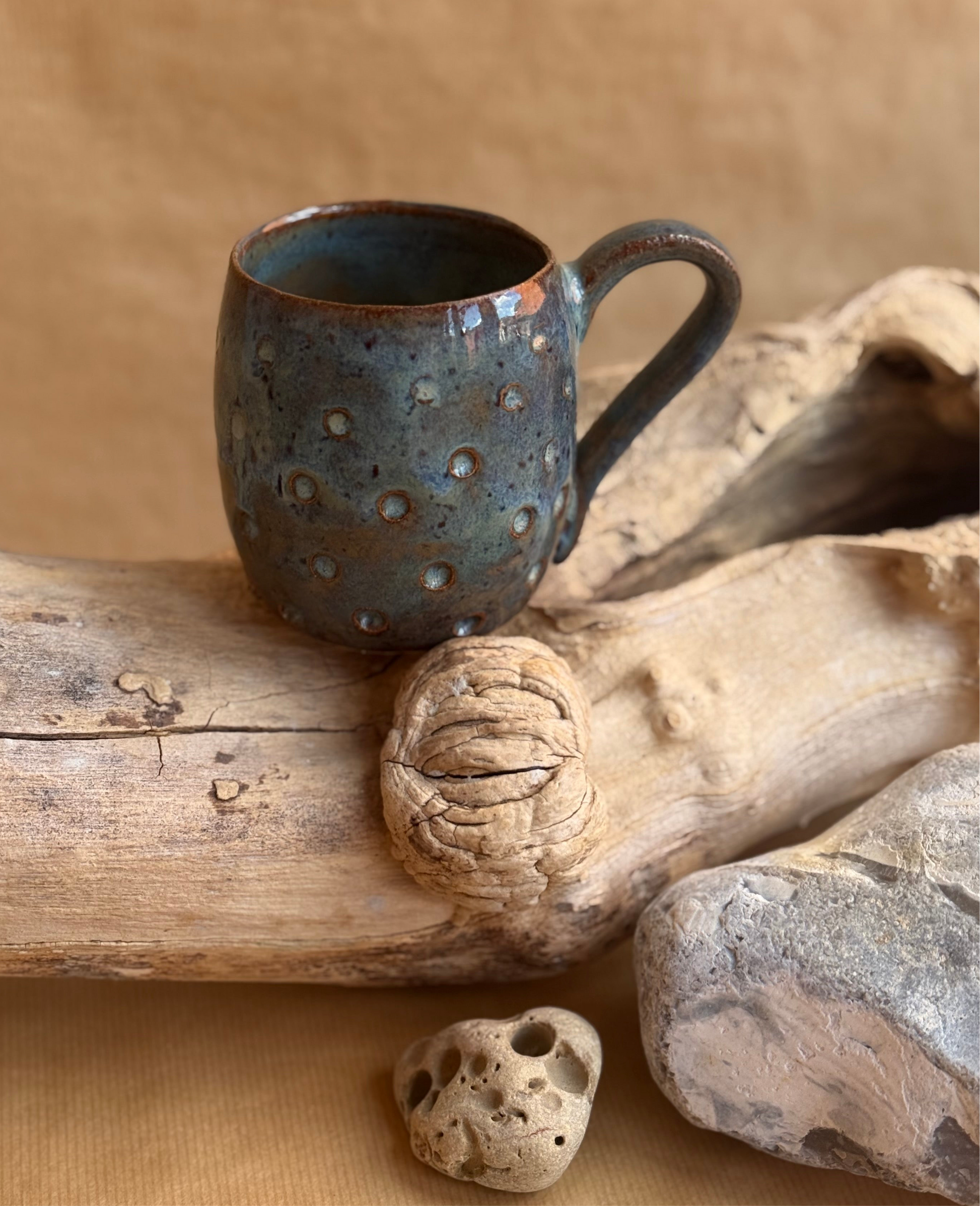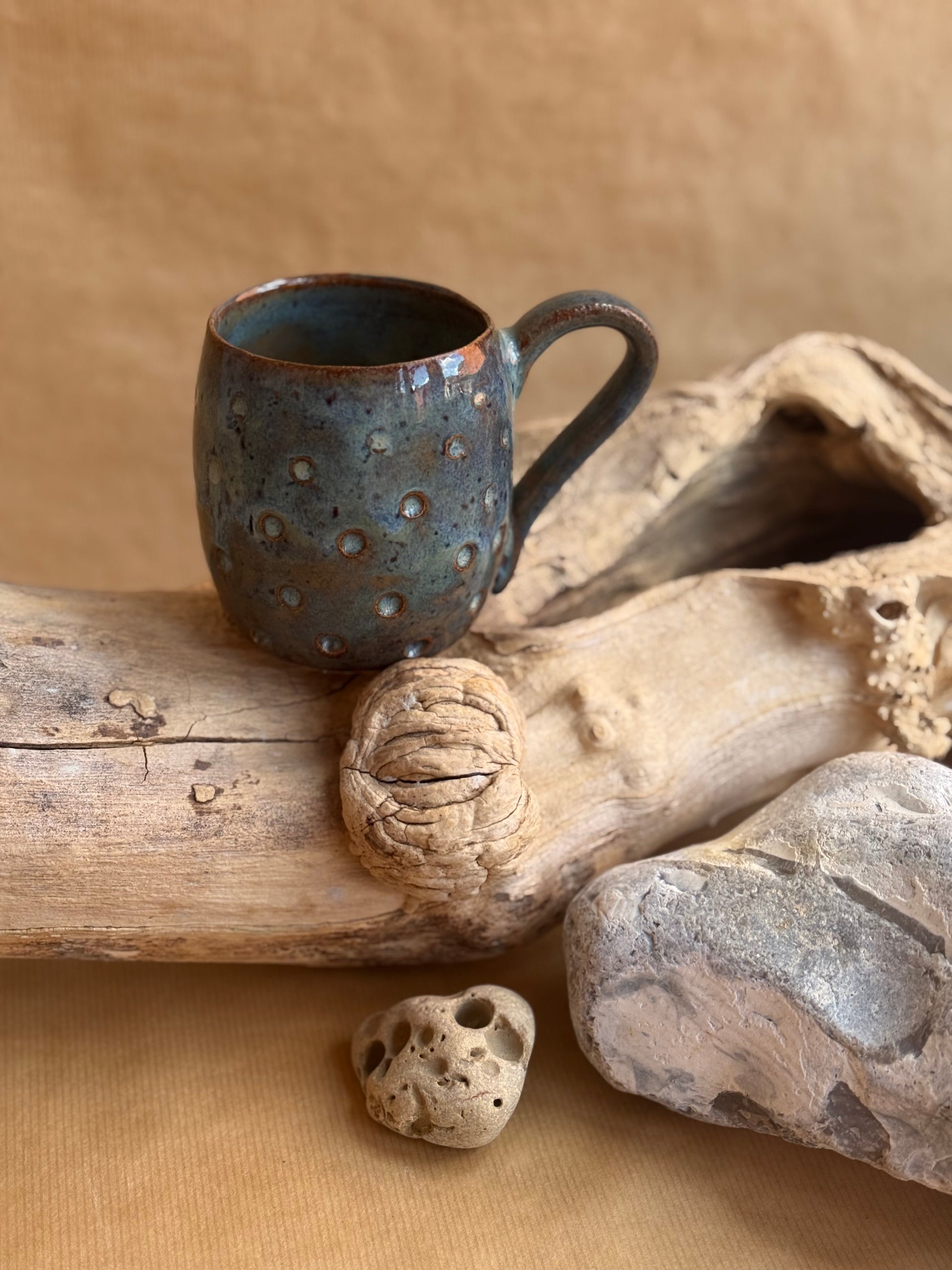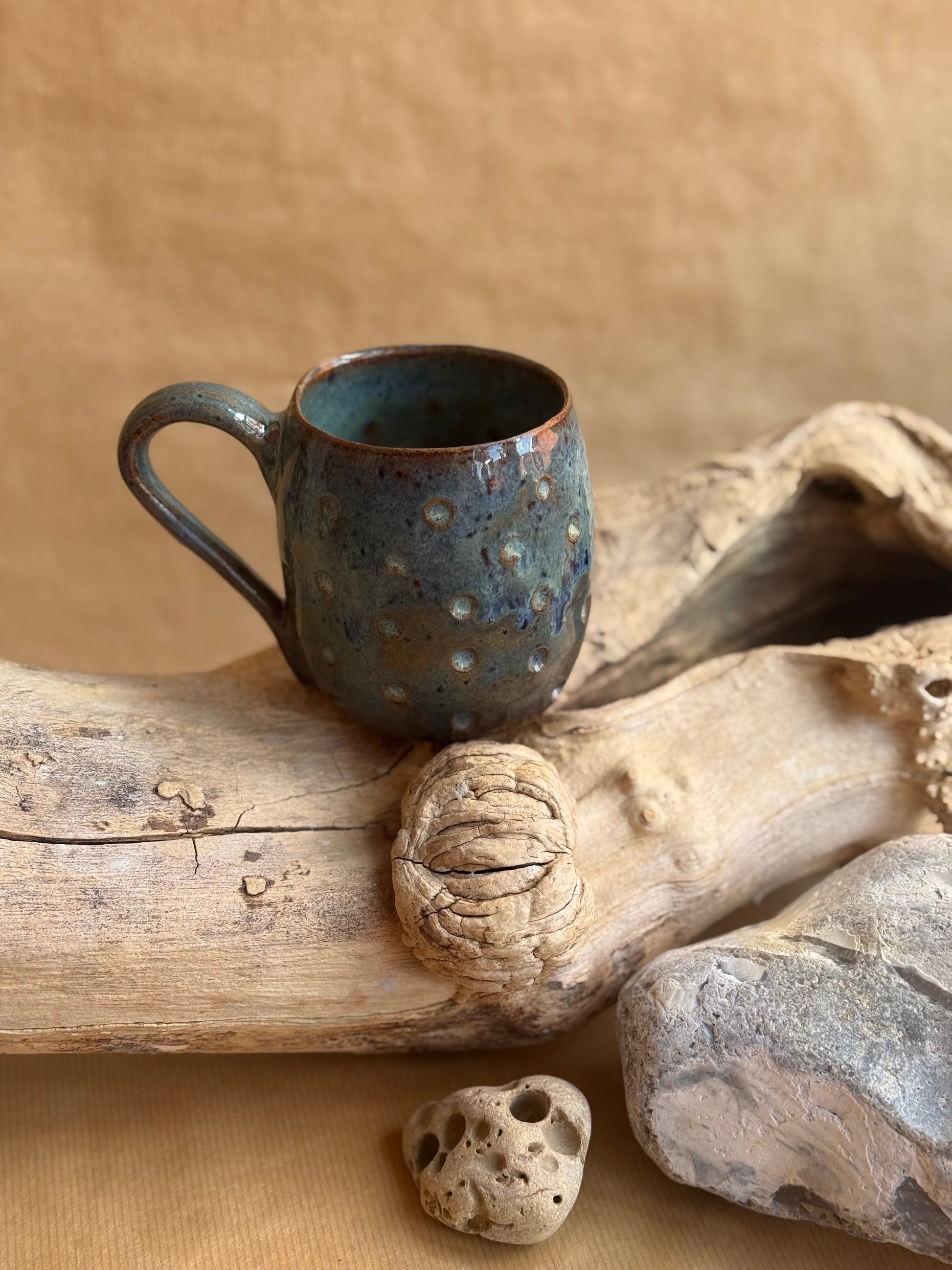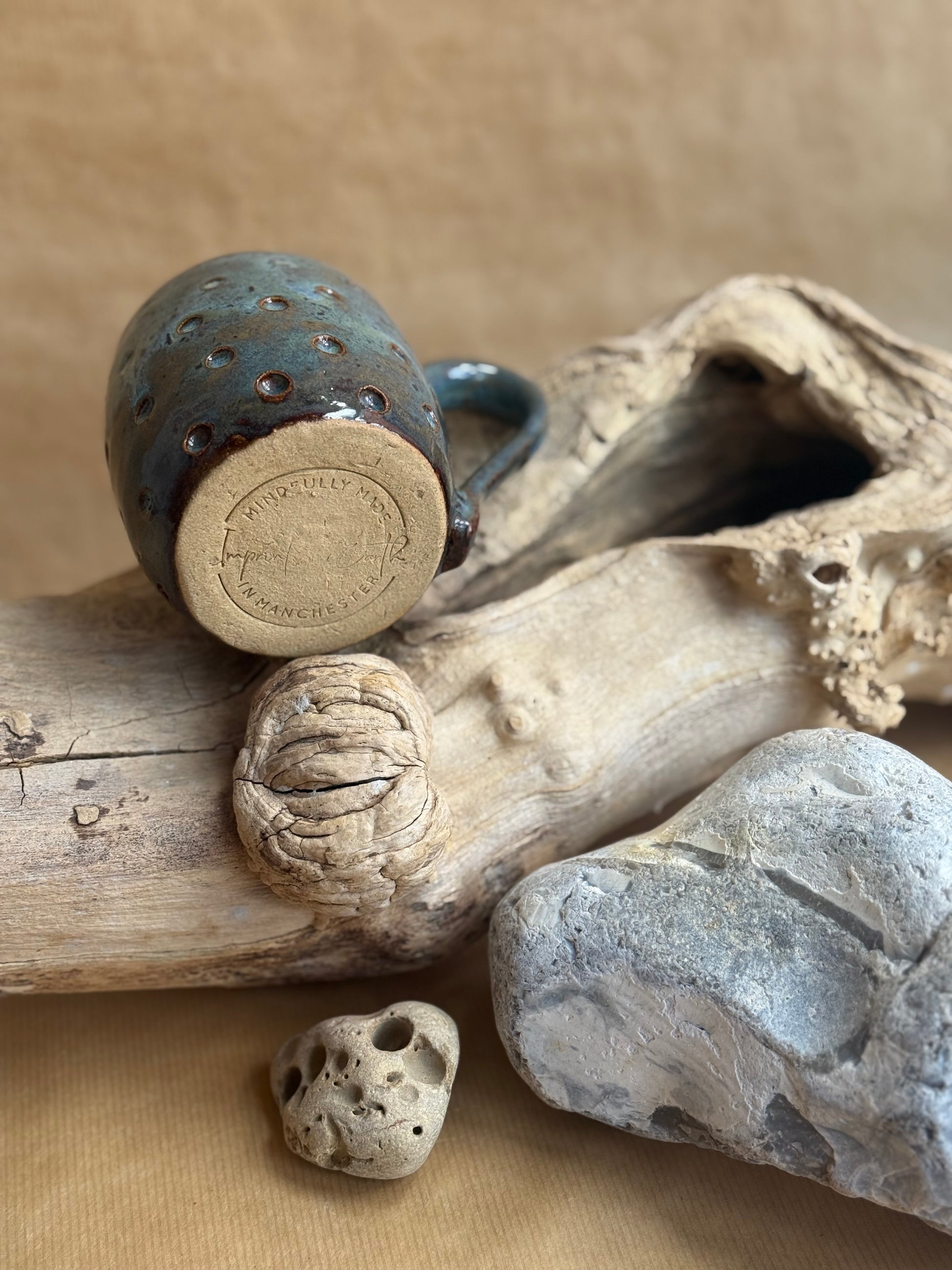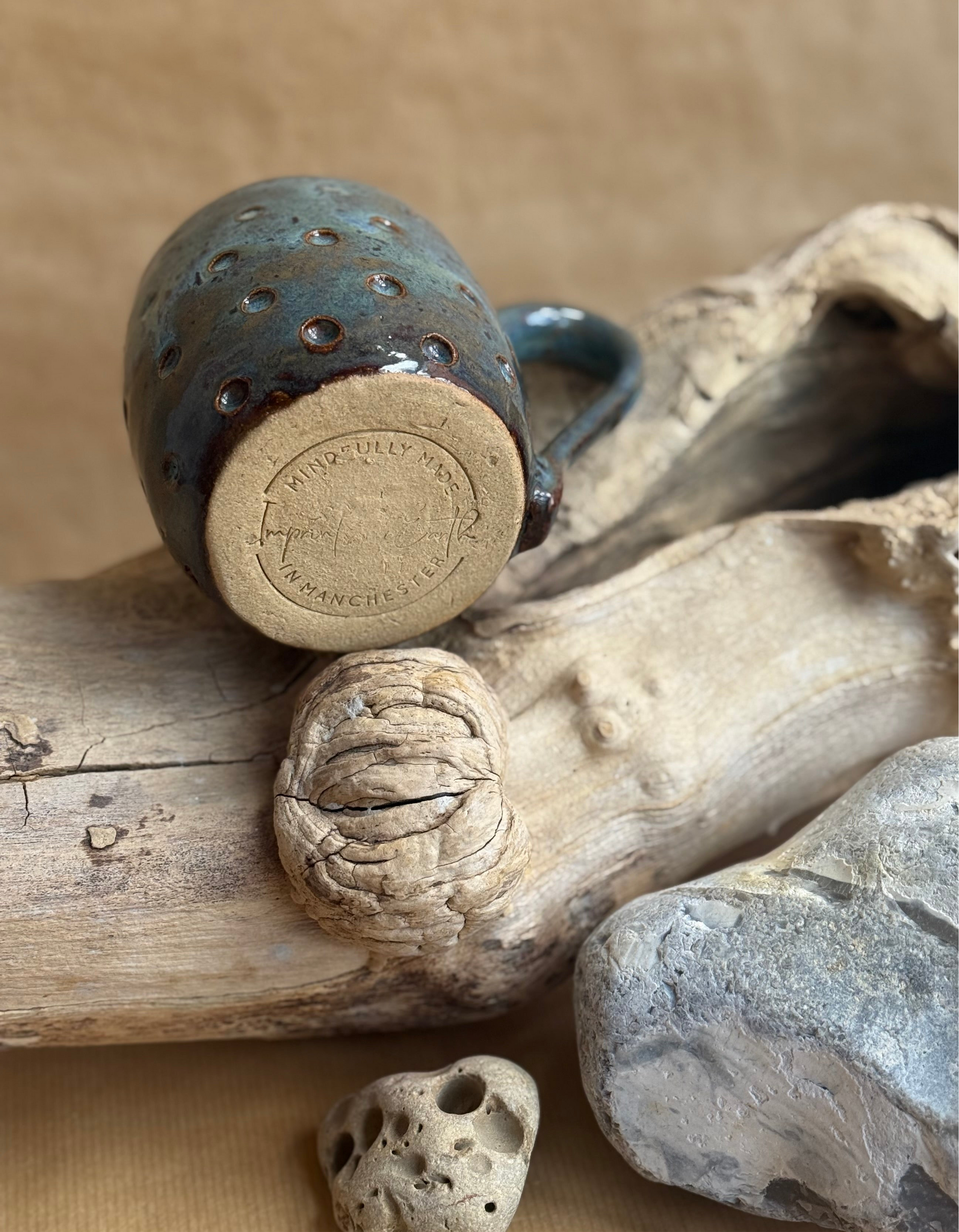 Our Imprints of Earth mugs are pure comfort in a cup! This mug has been glazed in playful coastal polka dot hues, perfect for those brews. This piece is completely unique, and handmade on a potter's wheel. A beautiful spirited gift or perfect for home, mindfully made in Manchester.